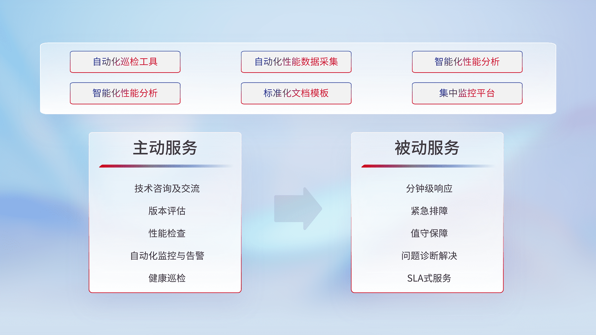 智能化工具和标准化文档,,保障服务质量,,,提供主动服务(包含技术咨询、、、版本评估、、、、性能检查、、自动化监控与告警、、健康巡检)和被动服务包含(分钟级响应、、、、紧急排障、、、、值守保障、、问题诊断解决、、、SLA服务)。。。